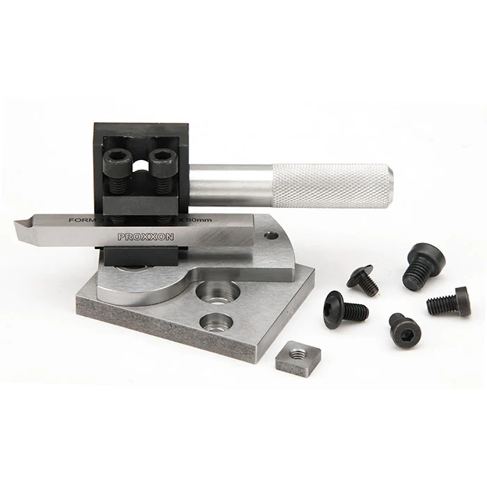 Is mounted on the cross slide in place of the tool holder. For producing convex and concave shapes, for turning radii or 3/4 spheres up to max. 32mm. Height adjustable tool holder (boring tool tip adjustable from 30 through 45mm above cross slide). Dimensions: base plate 67 x 50mm, height 55mm. Complete with finishing cutter 8 x 8 x 80mm. In wooden box with sliding lid.